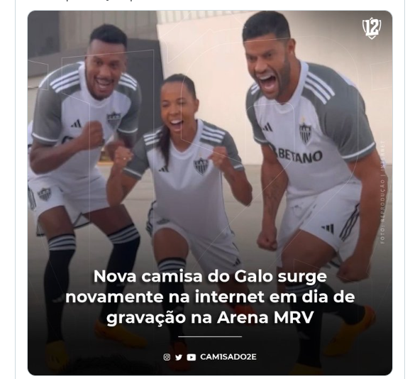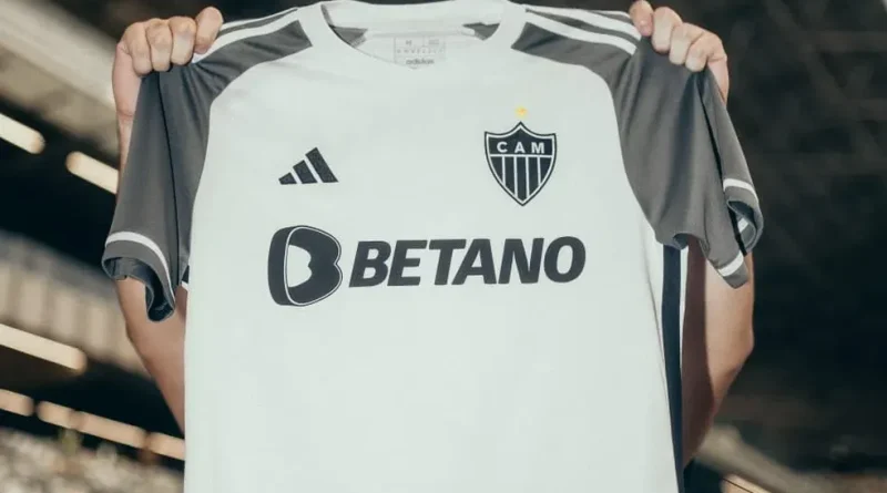 Desta vez, é possível ver o novo modelo de camisa de visitante do Galo em Edenilson e Hulk. A camisa terá as mangas na cor cinza, em referência ao novo estádio do clube, que tem a cobertura “zebrada”. Já o patrocinador máster – a casa de apostas Betano – passa a ter o seu logotipo em preto.
