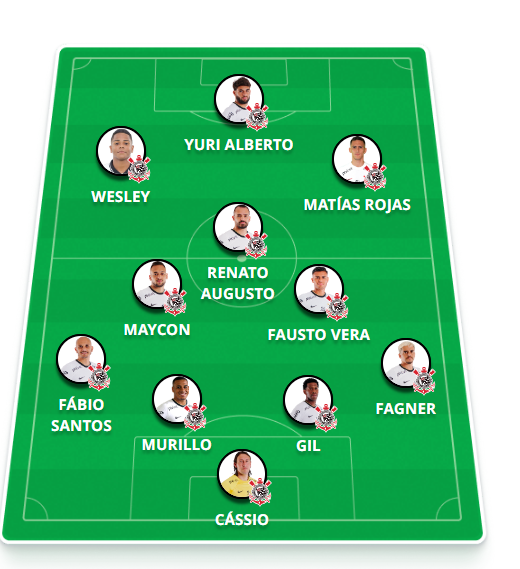 Time provável: Cássio, Fagner, Gil, Murillo e Fábio Santos (Matheus Bidu); Fausto Vera, Maycon (Ruan Oliveira, Roni, Giuliano ou Caetano), Renato Augusto e Matías Rojas; Wesley (Adson) e Yuri Alberto.