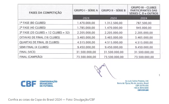 Na terceira fase, todos os clubes, independentemente de divisão, passam a receber a mesma cota de participação: R$ 2,2 milhões. Já a classificação para as oitavas de finais vale uma cota de R$ 3,4 milhões.