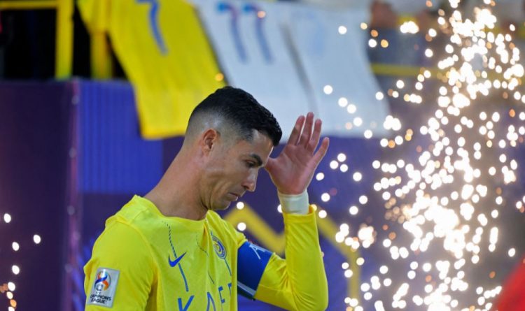 Atacante português nº 07 do Nassr, Cristiano Ronaldo, gesticula antes do início da partida de futebol da Liga dos Campeões da AFC entre o Al-Nassr da Arábia Saudita e o Al-Fayha da Arábia Saudita, no Estádio Al-Awwal Park, em Riad