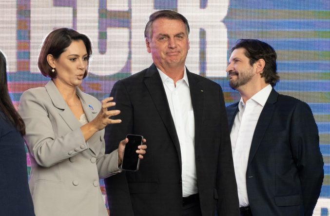 André Ribeiro/Futura Press/Estadão ConteúdoMichelle Bolsonaro gesticula ao lado do marido, Jair Bolsonaro