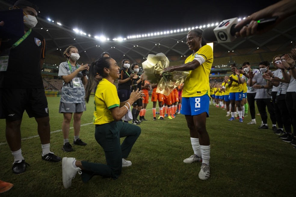 A eterna camisa 8 leva consigo também o desejo de Marta, que, de joelhos, pediu que ela seguisse contribuindo com o futebol feminino. Aliás, a rainha fez uma odisseia para chegar a tempo da despedida. Voo atrasado, voo perdido, escalas, chegada no começo do segundo tempo. Os problemas pessoais ficaram temporariamente nos Estados Unidos. O momento era de abraçar sua colega de anos, sua amiga. Assim o fez.