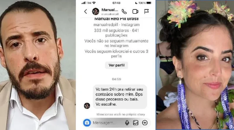 O influenciador digital mandou mensagem à atriz exigindo que ela retirasse da internet um vídeo que satiriza comentários dele a respeito de mulheres. Caso contrário, ela receberia “processo ou bala”, segundo ele, sugerindo que a mataria.