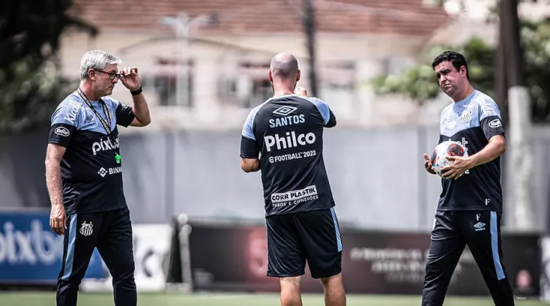 Odair Hellmann e membros da comissão técnica do Santos — Foto: Raul Baretta/ Santos FC