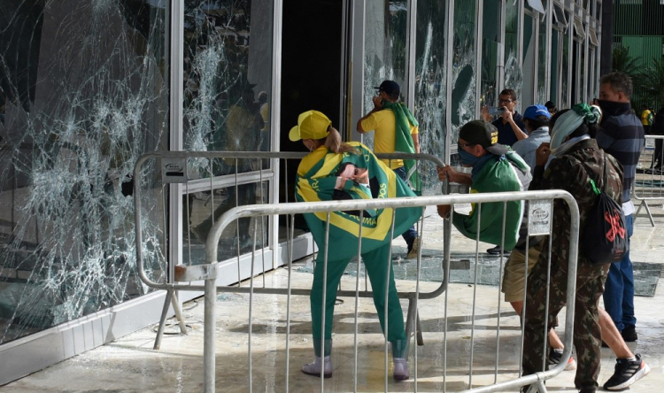 Manifestantes destroem uma janela do plenário do Supremo Tribunal Federal, em Brasília, no dia 8 de janeiro de 2023