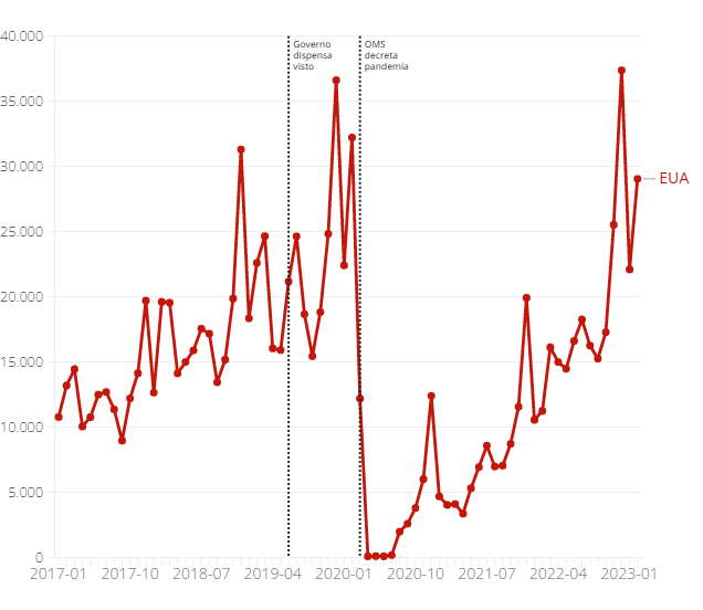 No pico de 2019, em dezembro, já sob a isenção de visto, 36.615 turistas americanos entraram no país. Foi o segundo maior número da série que começa em 2017 e vai até fevereiro deste ano.